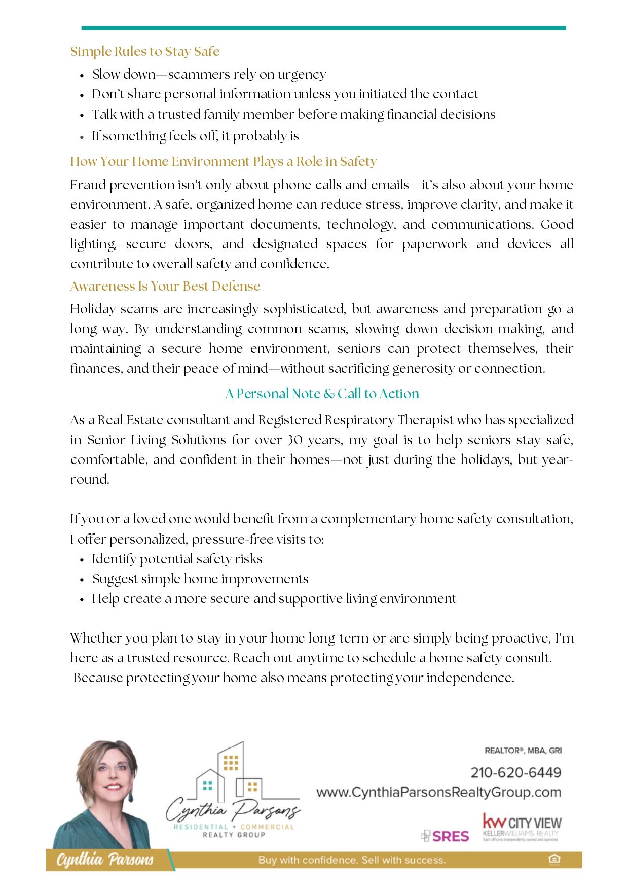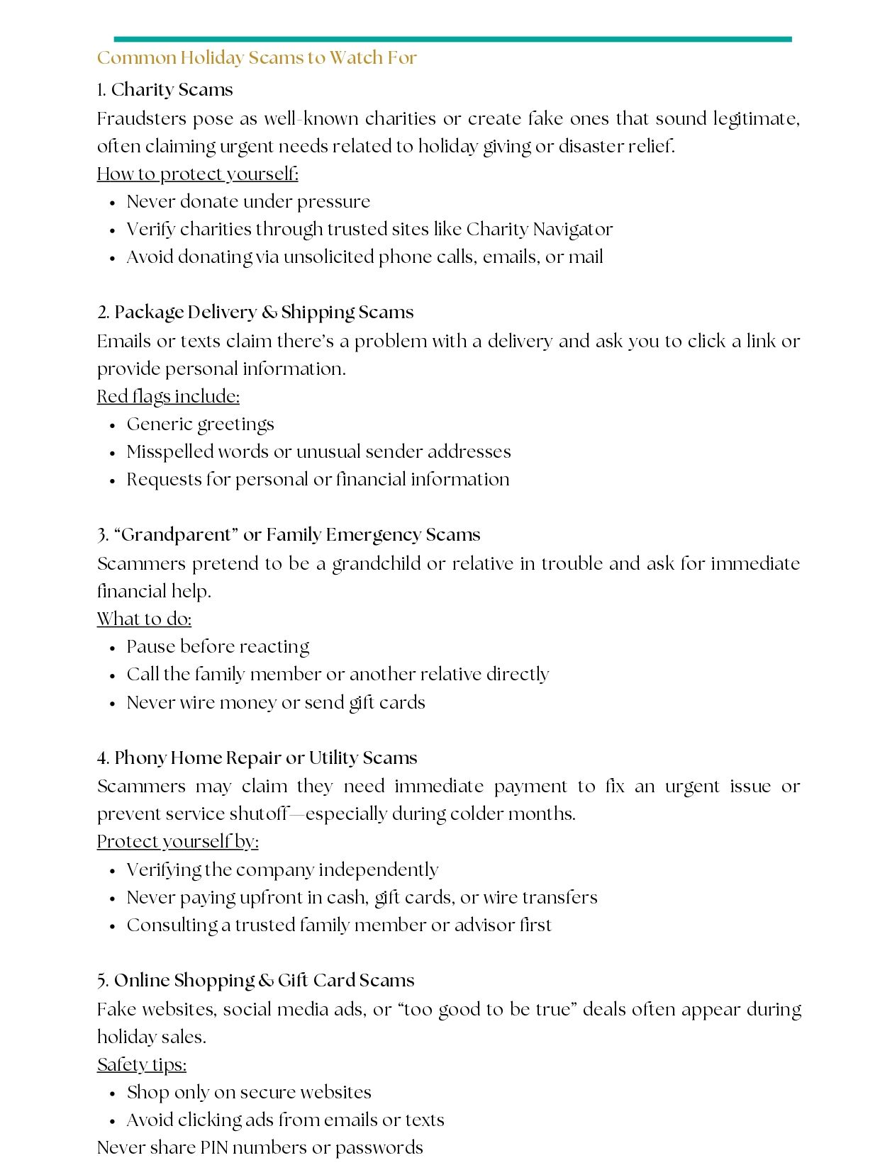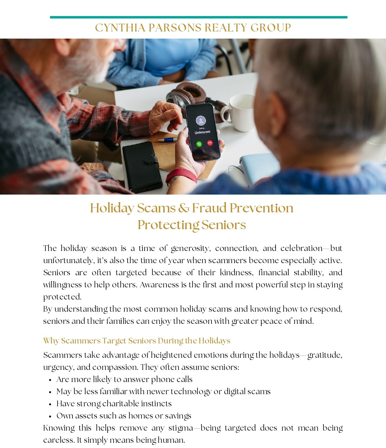 The holiday season is a time of generosity, connection, and celebration—but unfortunately, it’s also the time of year when scammers become especially active. Seniors are often targeted because of their kindness, financial stability, and willingness to help others. Awareness is the first and most powerful step in staying protected